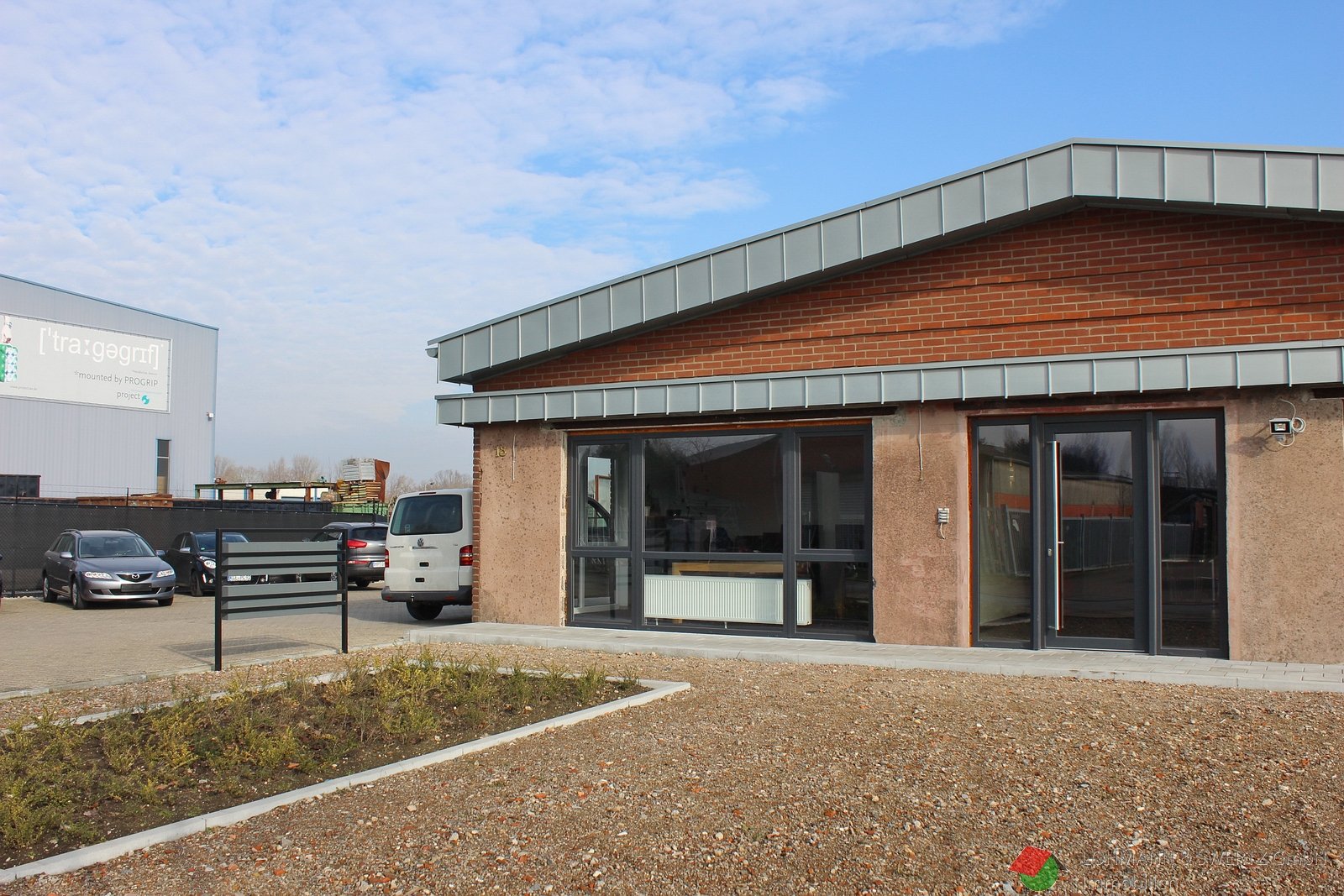Kreis Kleve, modernes Bürogebäude mit Stellplätzen im Grenzgebiet zwischen Kleve und Nimwegen.